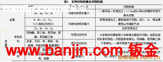 与氧乙炔切割和等离子切割比较,激光切割材料的种类多,包括金属、非金属、金属基和非金属基复合材料、皮革、木材及纤维等。但是对于不同的材料,由于自身的热物理性能及对激光的吸收率不同,表现出不同的激光切割适应性。采用CO2激光器,各种材料的激光切割性能见表2。